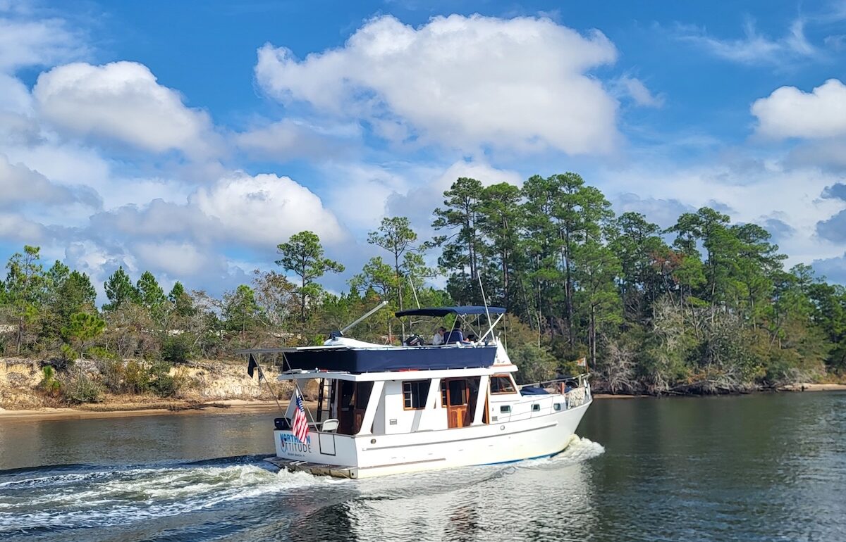 On Sunday, we departed Panama City Beach and made our way over to Apalachicola, where we will hang out for a few days while we wait for a weather window to make the Gulf crossing. When Loopers reach Carrabelle, they have to decide on how they want to get through the “Big Bend” of Florida. Option A is a 130 or so mile crossing down to Tarpon Springs or beyond, which can require a 24-plus-hour window depending on the speed of your boat. Option B is to take the “Big Bend” route, which goes from Carrabelle to Steinhatchee, Steinhatchee to Cedar Key or Crystal River, and finally another jump to Tarpon Springs. There is no right or wrong decision; however, there are pros and cons to each. We’ll break these down in next week’s post as we take on our own Gulf crossing.