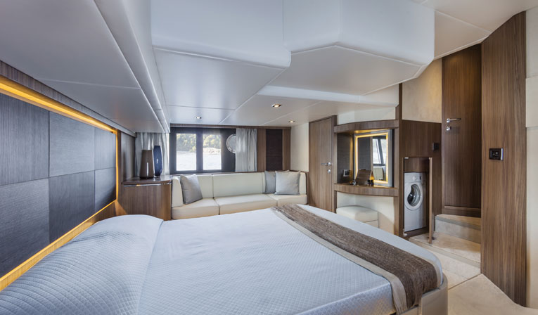 True to its philosophy, Absolute Yachts provides the 45STY with spirited on-water handling and performance. The attractive portside helm centers around a flush-mounted 12-inch multifunction display, complete with joystick docking control and a leather driver’s seat with armrests and reclining backrest. Powered by twin Volvo Penta IPS 600 engines, this yacht easily achieves a 35-knot top speed while burning just 1.14 gallons per mile.