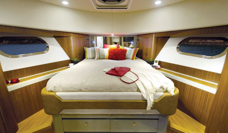 Hiding in the belly of the Belize 54 Day Bridge is a pair of 725-hp Volvo Penta IPS950 pod drives. A judicious application of throttle will produce a wide- open speed of 34.2 knots; however, most folks will want to cruise at around 28 knots, where the two engines burn a very reasonable 58 gph. Of course, some owners will peel back the throttles even further to enjoy more miserly fuel consumption for long-range jaunts. Since there’s IPS on-board, the 54 Day Bridge is easily maneuverable with joystick steering.