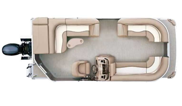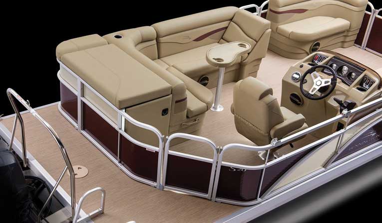 The standard L-shaped seating is the most popular setup on pontoon boats; what is not as common is the quality of this boat’s furniture. The seating has dual foam packs, and instead of typical monotone vinyl seat coverings found on most entry-level boats, it has Semtex two-tone fabric. Semtex looks better, is durable, and is far more comfortable than vinyl.