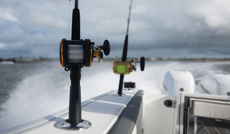 Rocket launchers on the hardtop, four gunwale rod holders on each side of the cockpit, and three more horizontal racks along port and starboard inwales provide a clutter-free environment. Our test boat had two hardtop-mounted outriggers easily accessible for singlehanded days at sea.
