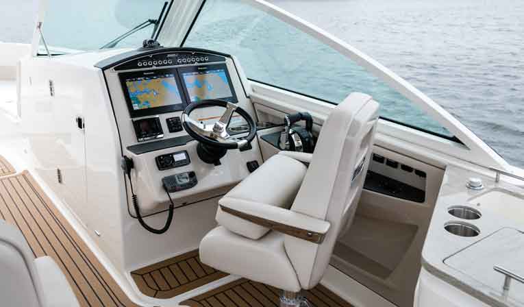 Standard power on the Vantage 320 is a pair of 250-hp Mercury Verado FourStroke outboards with hydraulic steering and electronic engine controls. Fitted with base power, the 320 Vantage is good for a top end in the low to mid 40-mph range, with an efficient cruise speed in the mid- 20s. Go all in and opt for the maximum rated power, two 350-hp Mercury Verado FourStrokes, and the Vantage 320 pushes well into the low 50s, cruising efficiently in the low 30s.