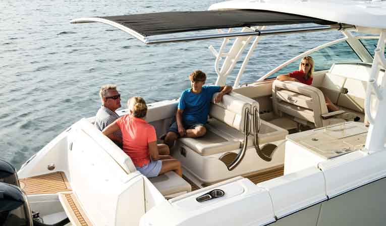 Boston Whaler is known for its clever, transformer-like seating arrangements, and the 320 Vantage does not disappoint. Back in the aft cockpit is a seating unit that can be used as an aft- and forward-facing bench arrangement, but also can be easily converted into an expansive chaise lounge (forward- or aft-facing), or into a wide and comfy sunpad. Other amenities in the cockpit include a wet bar and grill with a sink, a refrigerator and lots of stowage drawers.