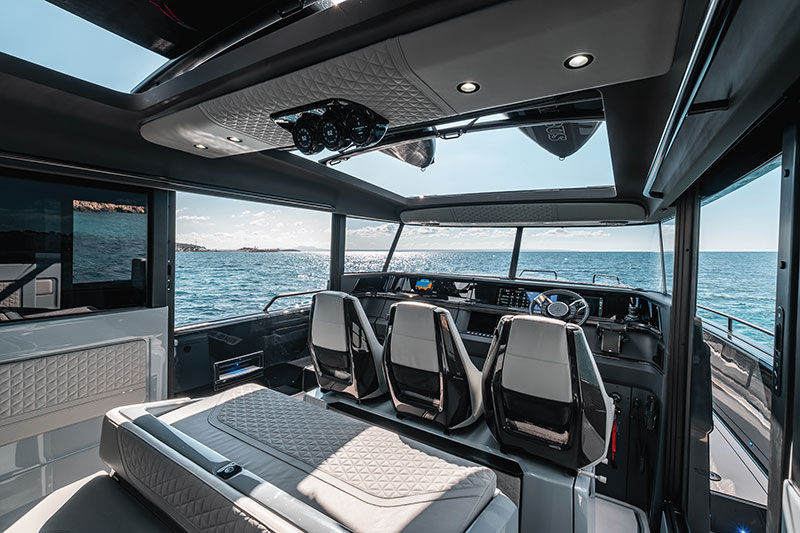 Five separate gathering and entertaining spaces provide plenty of room for the owners, their family and their guests. The bow provides a large lounge and a raised sunpad. The aft deck can be configured in several ways including an aft-cabin, an open aft deck, a U-sofa, and an aft deck bench. The helm and cabin also deliver on seating and accommodations with triple-wide bolsters at the helm, a cockpit wet bar with sink and refrigerator, a wraparound sofa, a large dining area and balcony doors to port and starboard. Slide back the dual sunroofs and your Brabus cabin cruiser is now an open boat.