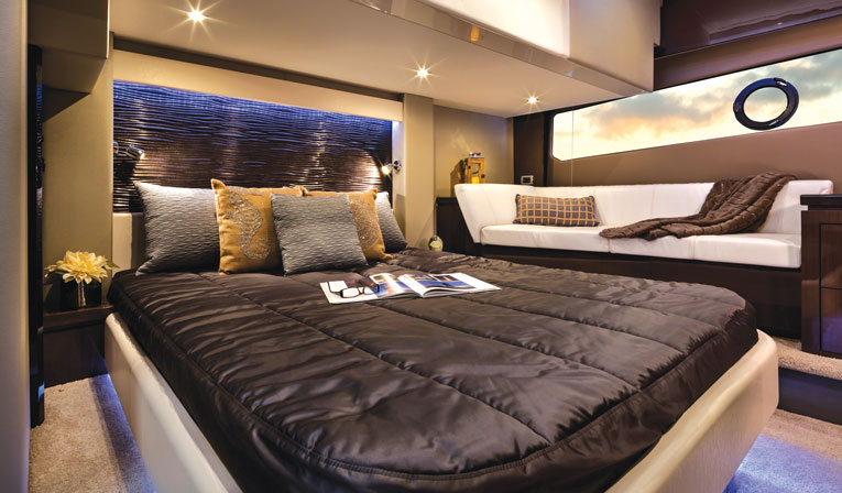 With a few cool features, the master stateroom can double as a mid-day hideaway to refresh and recharge. Located midship and at full beam, the master boasts spaciousness that eliminates that closed-in feeling sometimes found on yachts this size.