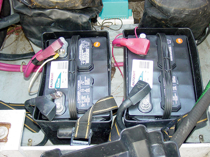 7. Battery and primary switch: You need power to start your engine and that comes from the starting battery. It can be a single battery or a battery bank (two or more batteries connected in parallel to mimic a single, large battery). Most boats have DC volt meters (typically at the main DC control panel) to help monitor battery charge; however, a handheld multimeter can also be used. The battery switch (typically big and red) allows you to turn battery power to the engine on or off.