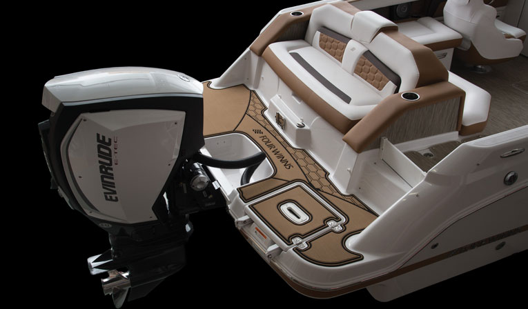 A major focal point and coveted seating area is the luxurious swim platform lounge. Accessed via a walk-through transom, an aft-facing bench seat overlooks the non-skid surface swim platform. Life is sweet during coving moments or while watching the sunset thanks to two armrests offering built-in stainless steel cup holders, a stereo with smartphone connectivity and four speakers throughout the boat. Be sure to ask your dealer about the option to upgrade to JL audio speakers and subwoofers, which come with a remote and a transom display.