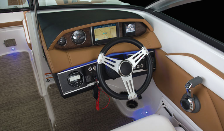 The U-shaped cockpit includes under- seating room for a built-in cooler and dedicated space for a carry-on. Seating in the bow and cockpit swings up to reveal fiberglass-molded storage cubbies. Along the centerline is an in-floor ski locker with a thoughtful gas-assisted strut for easy access. At the bow, a flip-up access locker conceals a telescoping deep-reach swim ladder. Both the forward and stern ladders use the deep-reach concept, which means you get an extra rung. For those of us whose joints and bellies are out of alignment, that extra rung makes boarding a pleasure, not an oxygen-deprived chore.