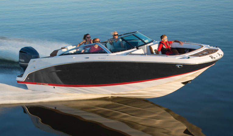 Our test boat came with an optional wakeboard tower and colored Bimini top. The Turbo Swing Ski Tow is ideal for outboard-powered boats since it pivots the towline and swings across the wake; it’s a feature that tubers and skiers will appreciate.