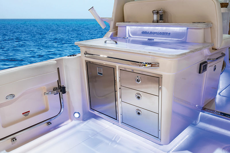 Feedback from owners who had experience with the 415 led to eliminating the 335’s transom door in favor of cockpit side doors both to port and to starboard, and a boarding ladder that can be used on either side. This arrangement provides great water access for multiple swimmers, stress-free landing of large fish, and easy boarding from a floating dock on either side, all while saving space at the transom. Fuel fills on each side ease access to gas docks.