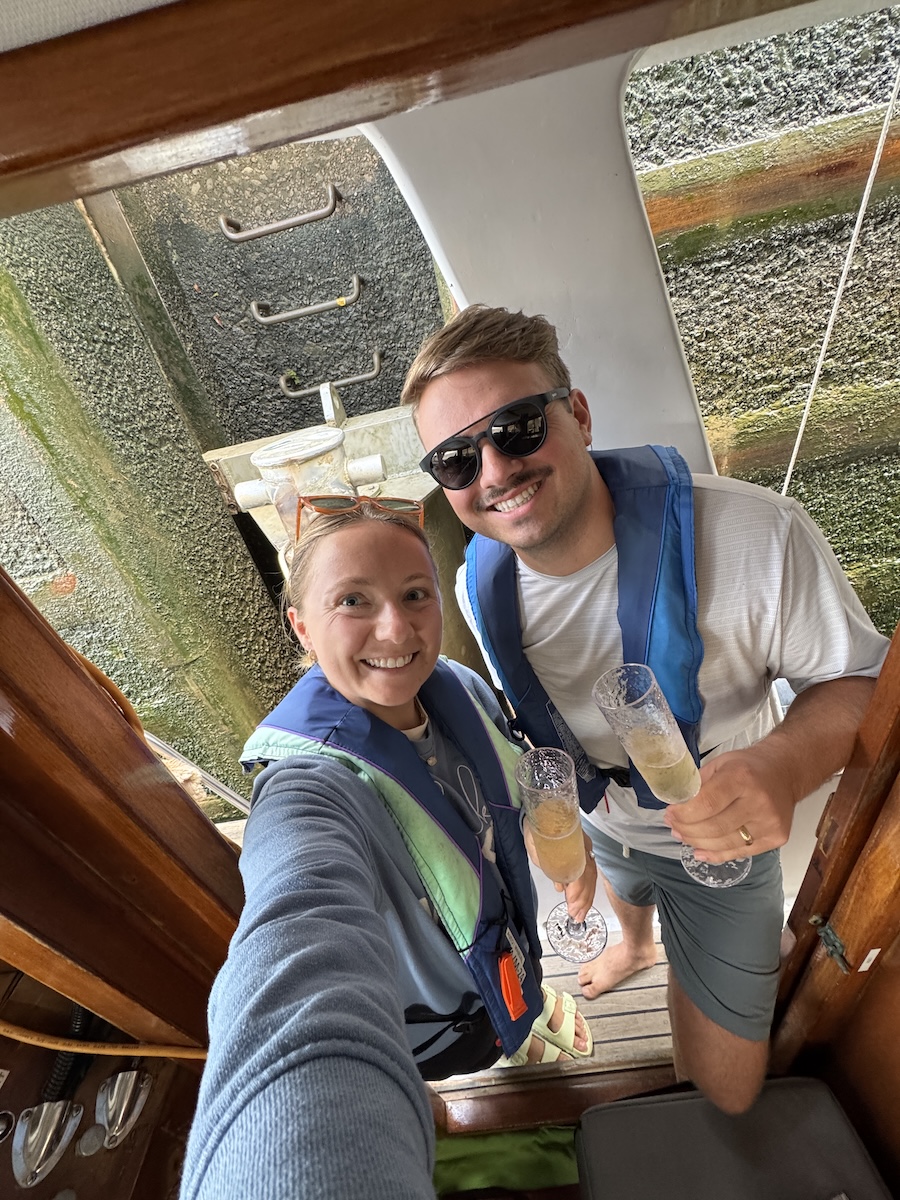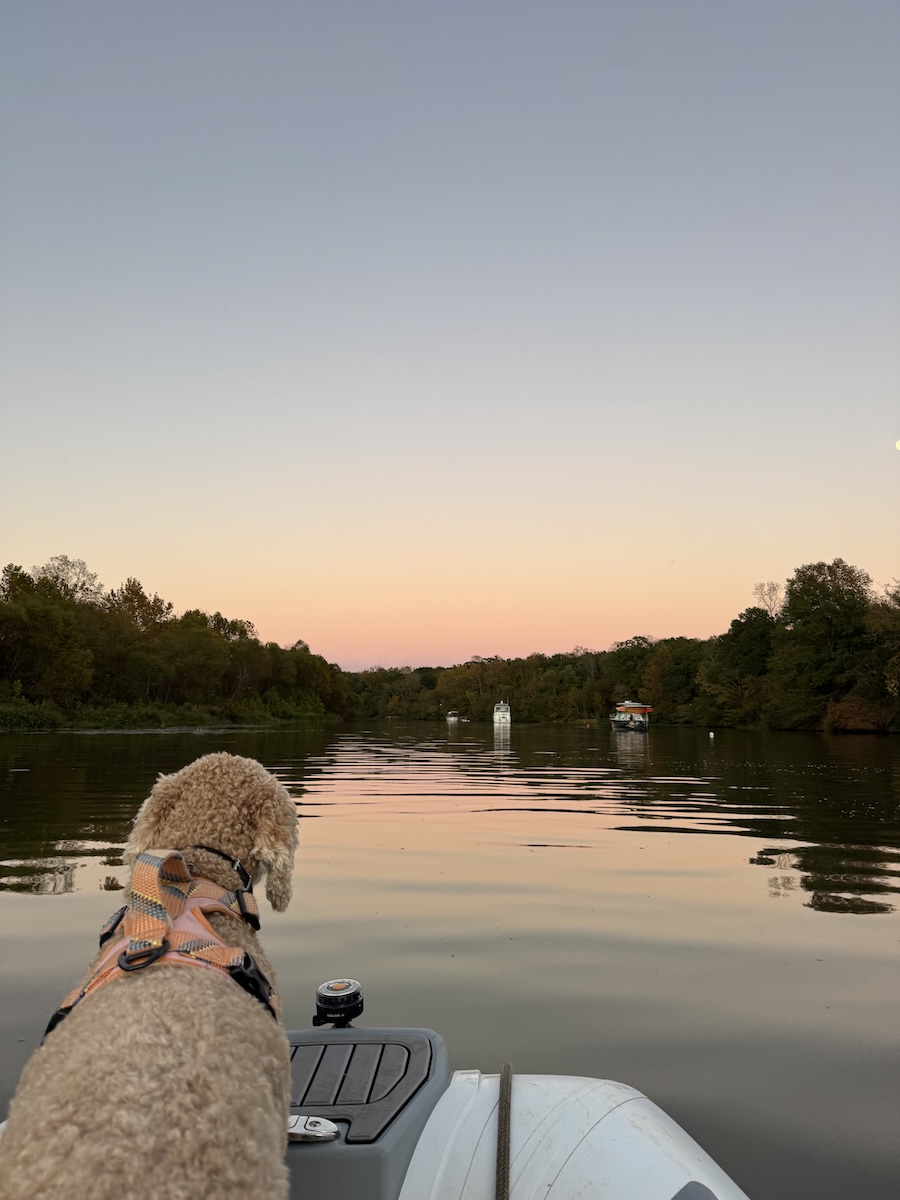 Monday morning, we woke up to the thickest fog we’ve experienced, maybe ever, in our lives. We were anchored about 50 yards from Slacker, our buddy boat, and we could barely make out their boat! The dinghy ride to take Ripley to land was a little eerie, but luckily, a short ride. We were anchored near five other Loop boats, so we coordinated with the lock to get in right when the fog began to burn off. Three locks and 31.5 nautical miles later, we anchored for the evening and enjoyed docktails with a new Loop boat we met that day.