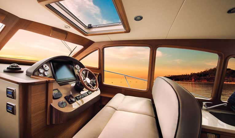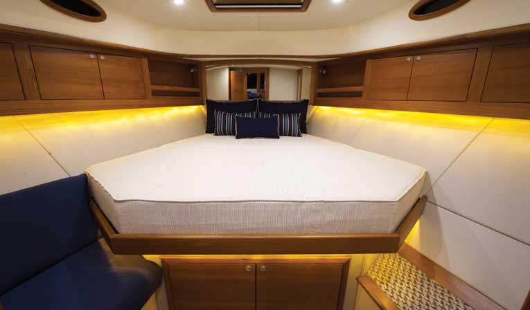 Our review boat had a starboard galley in the main salon with a large dinette/lounge area to port. The master stateroom is situated in the bow with a double island berth and is packed with plenty of stowage cabinetry. It’s trimmed out with leather, flawless teak and well-placed cloth accents. The guest cabin is to port on the lower level and shares an enclosed head/shower with the master stateroom. Nothing creaked or groaned underfoot and everything — including cabinet drawers and bilge access panels — worked and fit together perfectly.