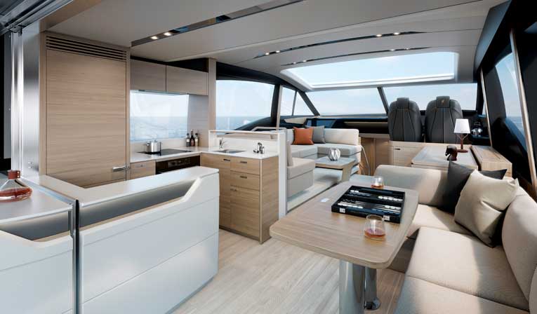 In true Princess fashion, the salon presents beautiful cabinetry and a comfortable space for entertaining. With a wide-open area courtesy of a 16-foot beam, the interior features a portside galley (an open window aft allows for food service) a dinette table to starboard and an entertainment console just forward. The lower helm — offering a pair of seats for the captain and copilot — is to starboard, while yet another seating/dining area lies directly opposite.