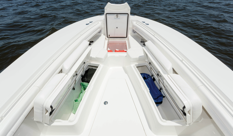 From bow to stern, the 31 is all Regulator — rigged and ready to handle anything found in both inshore and, especially, offshore waters. It all starts up in the bow area with the anchor locker, 230-quart center forward storage, a 500-quart in-deck fishbox that can also serve as a rod locker, and a pair of 210-quart insulated fish/dry storage boxes, one found to starboard and one to port. The entire bow area has an integrated handrail. Just forward of the center console is a seat, beneath which is an insulated cooler, and fully aft is a transom fishbox and livewell.