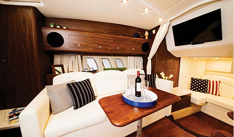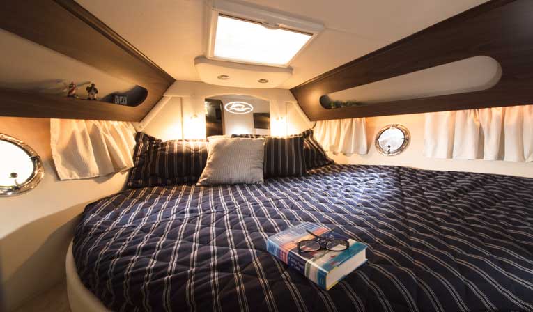 The galley has everything you need, from a microwave and a two-burner electric cooktop to a 4-cubic-foot fridge. But the cockpit is where you’ll be spending most of your time afloat, and it’s laid out to maximize fun. The skipper’s “office” is arranged for easy control, with Raymarine touch- screen electronics, a Mercury VesselView monitoring system and an Axius joystick to make docking a cinch. The doublewide helm seat has flip-up bolsters for standing, and a curved seat is opposite. There’s a wetbar aft with a sink, an icemaker and a fridge to service two more lounge seats. An arch is standard, but most buyers will add the hardtop, which includes a full camper enclosure for the cockpit.