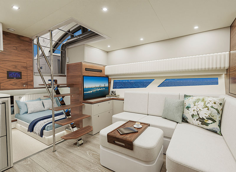 The single-level salon and cockpit, with aft sunshade, offer abundant lounging and dining space with a hi-lo table that easily converts to a large sunbed. The helm, forward and to starboard, offers a large console for adding a range of in-dash chartplotters, while a pair of bolstered pedestal chairs assure comfort and great visibility for the captain and the co-pilot.
