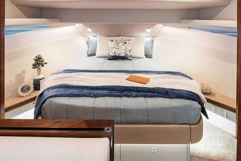 For those extended trips away from home, the 4300 Sports Express presents a beautiful owner’s stateroom, complete with an ensuite head. Guests enjoy the comfort of two spacious berths arranged in an aft cabin arrangement. Between them sits a large lounge with a galley and seating area.