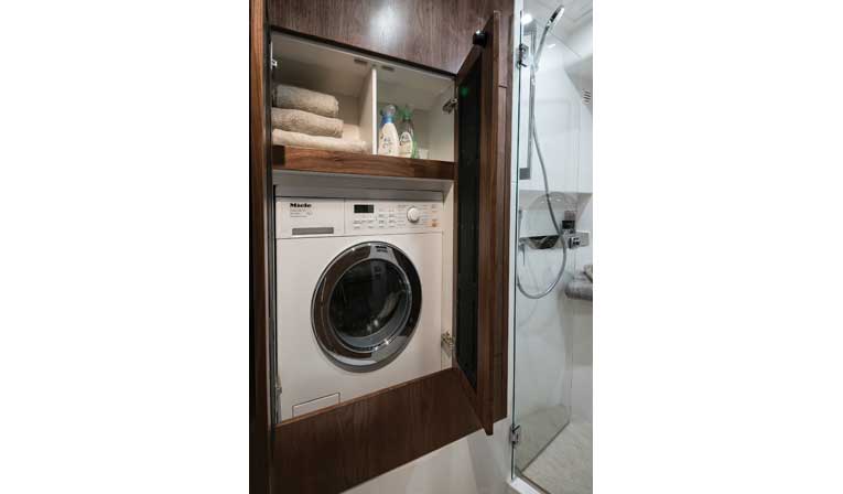 While sitting next to Young in the portside dual helm leather bucket seats, I did not detect any creaking, squeaking or other sounds that would indicate inferior construction, even from below. Entry into the charging waves was soft without pounding or bone-jarring. When I asked how the yacht was able to run in these conditions, Young explained that Riviera properly balanced the hull by pushing the twin 600-hp Volvo D8-IPS800 engines farther forward for better weight distribution, with the pods connected via jackshafts. The engine locations also allow for a large garage that can house a tender.