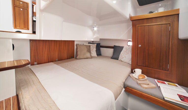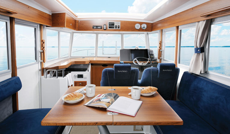 Hinged counter sections allow access to the stove and sink, and create serving space when folded down. A cold storage drawer hides below the helm seats and a built-in cabin heater extends the boating season. The passenger seat spins to join the salon where the dining table can also be folded in half and swiveled aft to create more space.