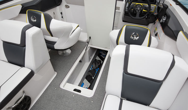 Like many boats today, storage is cleverly built into the cockpit floor and beneath select seats. A ski locker is even hidden in the SeaDek mat swim platform. Access from the water is easy, thanks to a concealed telescoping ladder. Everything you’d want is within arm’s reach, from cup holders to stereo control.