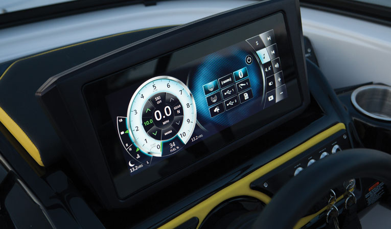 Scarab is at the forefront of technology adoption with the latest digital speed control. The touch-screen settings offer various modes, GPS, docking and speed controls for wakeboarding and surfing, with adjustability to within one-tenth of a mile per hour. When you are not in a tow mode, the controller offers an eco-mode to calculate the best cruise profile, creating a richer or leaner burn for emission controls.