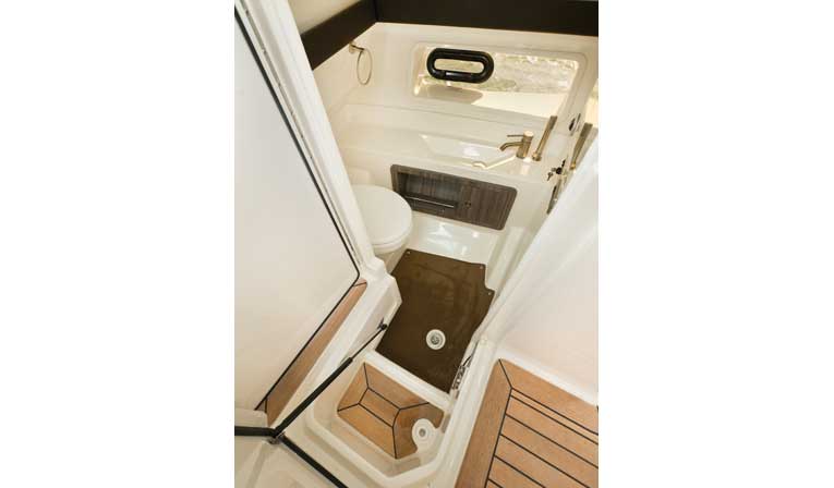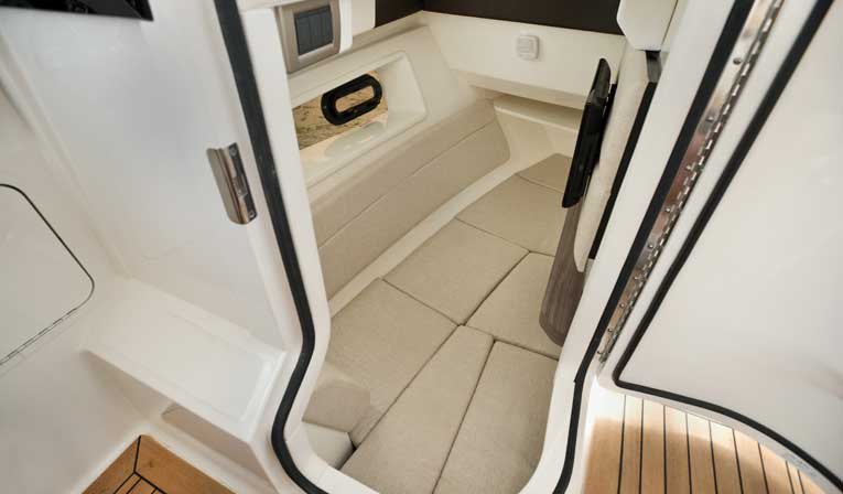 Not to be forgotten, the 350 has two cabins within the consoles that are sure to delight. Under the portside console is a mini hideaway, with hull window, cushioned seats and filler pads for sleeping — a nice option for the kids or a weekend overnighter. The starboard helm console cabin houses a vacuum-flush head, molded fiberglass liner with sink, vent, wood shelf and a 27-gallon holding tank. If planning to spend time onboard, opt for the TV in the port cabin, as well as AC in both cabins.