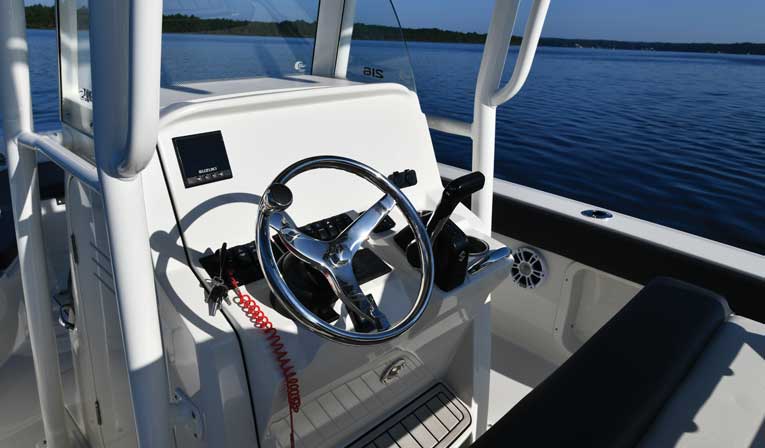 A fiberglass box is in the T-top with a locking glovebox and additional rocker switches for spreader lights and other accessories. The optional top in our review boat was a steel frame design with a canvas cover. In concert with the large, three-panel windscreen, it did a terrific job of protecting all onboard from the overhead sun or any occasional showers.