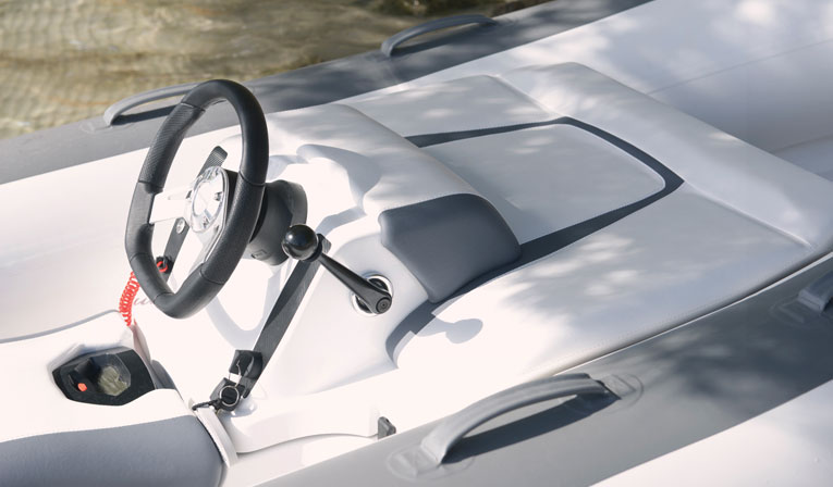The Minijet 280 is built on a rigid fiberglass hull with large-diameter wraparound sponsons that provide excellent stability, whether you load up with provisions or take the crew out for dinner. The 280’s 465-pound weight does mean you’ll need to have a retrieval system on-board, but most folks who buy this type of tender will already have such equipment installed. Inside, the driver sits straddled on a saddle-type seat behind the helm while passengers can make themselves comfortable on the cushy sponsons.