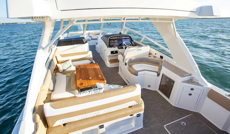 While I’m spending your money, might as well throw in the two, easy-to-read, 17-inch Garmin 8617 MFD displays at the helm. There’s room for them and your eyes aren’t what they used to be.